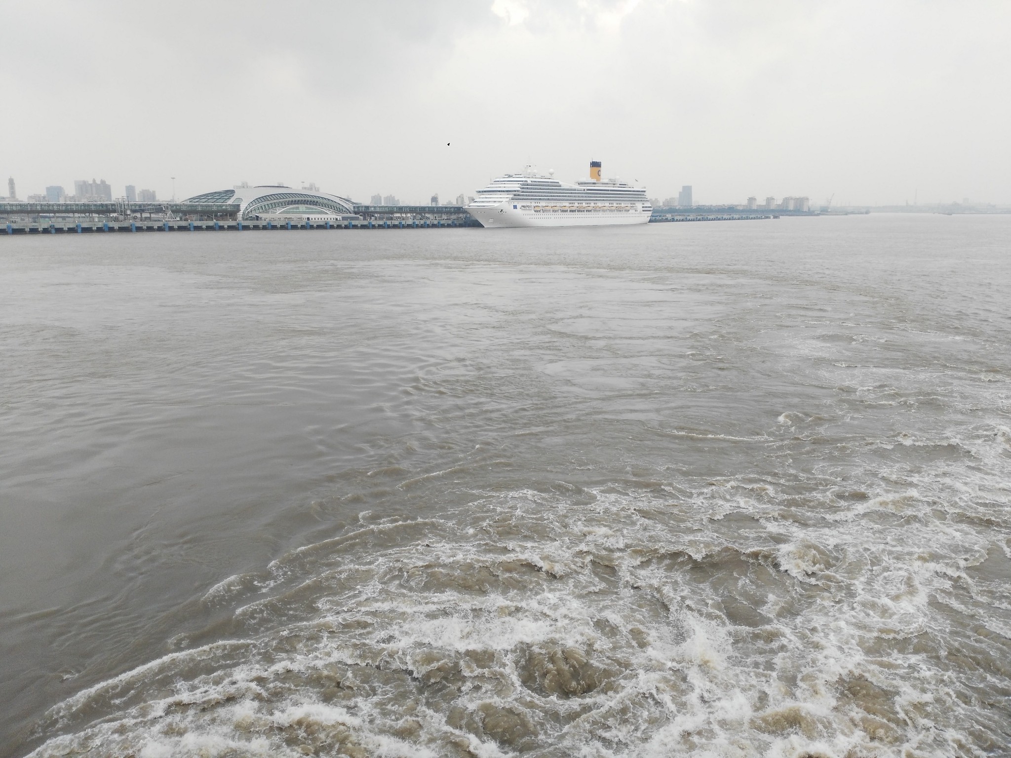 第一天下午邮轮从上海港口出发的时候,天灰蒙蒙的,海水混着泥沙,偶尔有飞机和鸟儿掠过。港口里过往的船只繁忙的来回,沿岸的建筑离我们越来越远,渐渐消逝在视线中,邮轮驶出了上海海域。